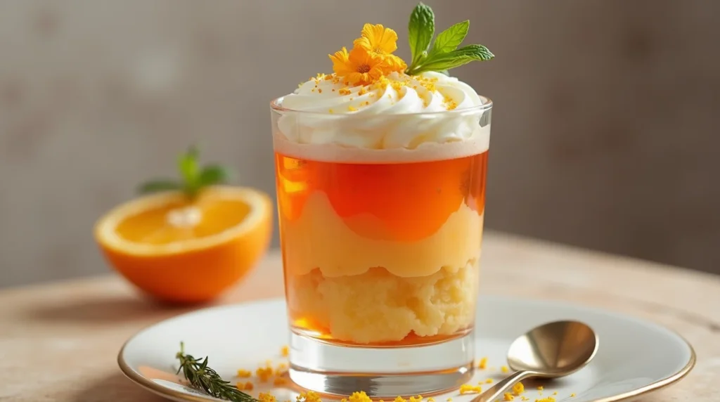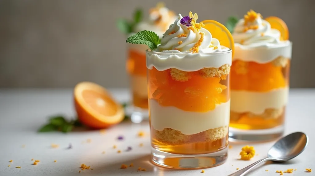 In clear glasses, layer sponge, Aperol custard, Prosecco jelly, and whipped cream. Chill each layer briefly before adding the next. Top with fresh orange zest, edible flowers, or mint leaves just before serving.