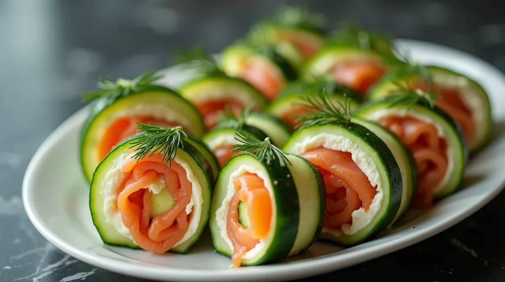 - Assemble the Rolls: Spread a small amount of the cream cheese mixture onto each cucumber slice. Top with a slice of smoked salmon if not pre-mixed.