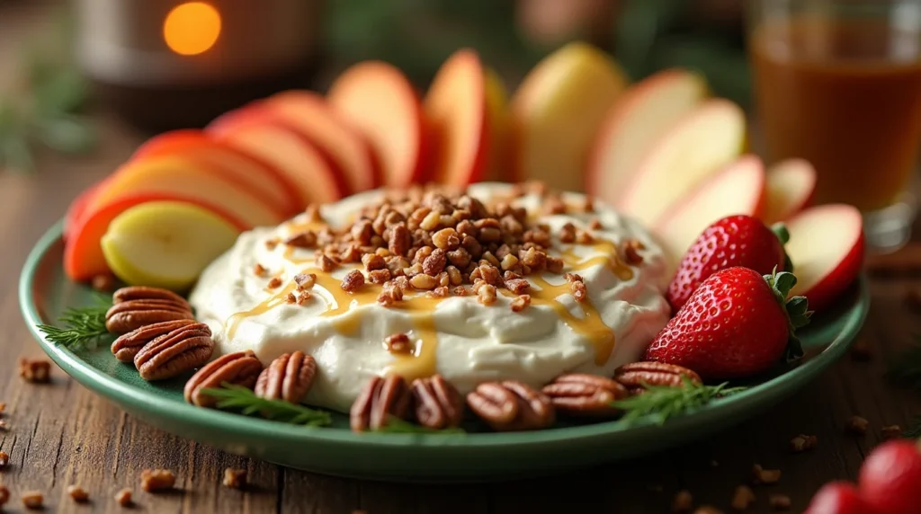Concerned about your dip’s look when serving? A drizzle of caramel or extra pecans can make it look great. Also, have tasty dippers ready, like apple slices or graham crackers.
