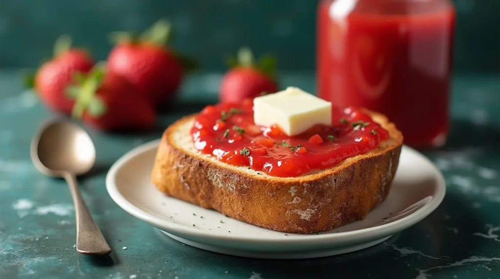 Easy strawberry rhubarb jam recipe on toasted bread with butter and fresh strawberries.