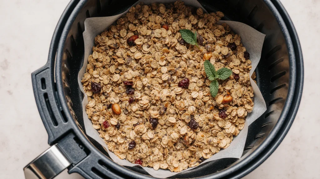 Line your air fryer basket with parchment paper or a silicone liner. Spread the granola mixture in a thin, even layer—don’t overcrowd the basket for best crunch!