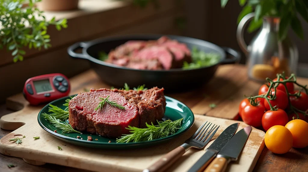 After perfectly roasting a beef ribeye steak or prime rib, it’s key to let it rest before carving. This step lets the juices spread evenly, making the meat moist and full of flavor.