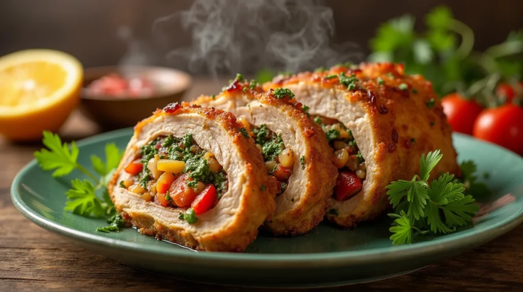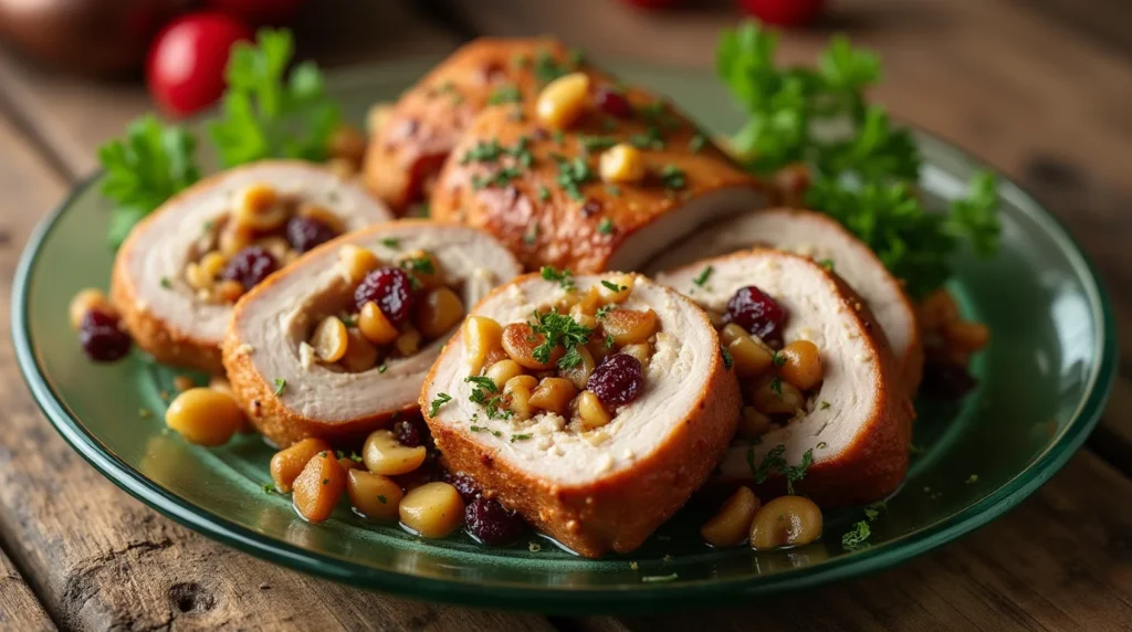 The stuffed pork loin also looks fantastic. Its golden-brown outside and colorful stuffing make it a stunning centerpiece for your holiday table. You can choose from many fillings, like herbs and garlic or fruit and nuts, to impress your guests.